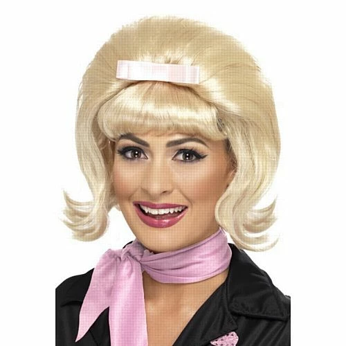 This 1950’s style beehive blonde bob wig looks great with any of our fifties rock and roll fancy dress costumes. It has a pale pink bow attatched to the top of the wig too.