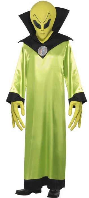 This green alien lord costume comes complete with a green rubber over the head alien mask, a green satin-feel robe with black stand-up collar and cuffs. It also comes with green rubbery alien hands with long finger tips to make you completely alien-like!! Ideal costume for halloween or for a space theme fancy dress party.