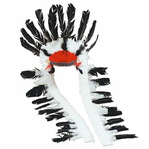 This Headdress has an elasticated red small feather headband with more elaborate trim along the bottom to replicate the traditional tribal Headdress. The black and white feathers then make up the halo and gently fall towards the chest. Team up with some of our coordinating fancy dress.Â