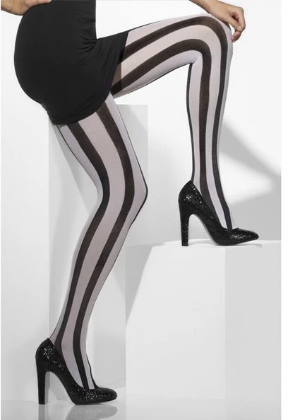 Our black and white vertical stripe tights are great for many fancy dress costues including a Beetlejuice costume at Halloween or a pirate wench costume. One size fits most adults