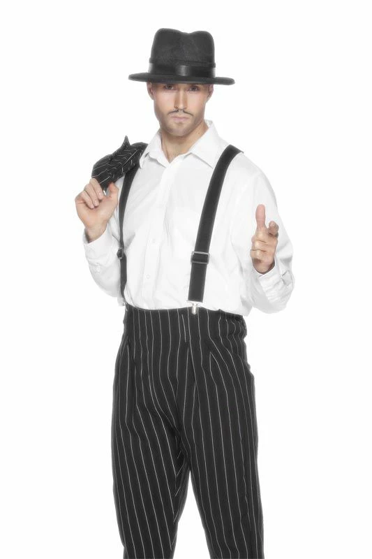 Gangster style black braces includes metal trouser clips and changeable lengths. Great accessory for any gangster themed party.