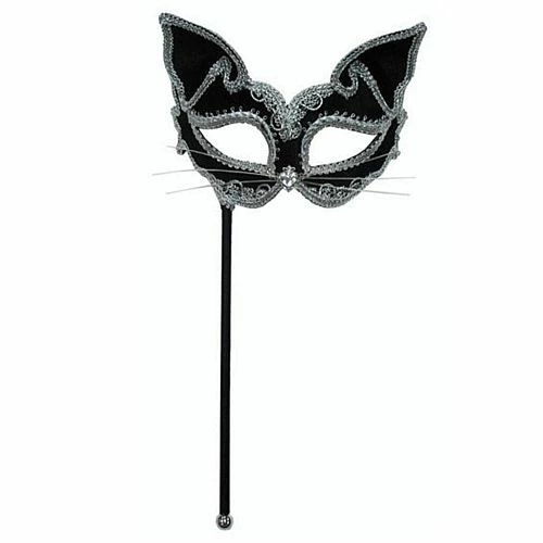 Celebrate a special event with this embellished design black and silver cat mask on a stick. This beautiful metallic shine embroidered detail hand-held cat mask with whiskers is perfect for a masquerade ball, VIP style events, themed parties, fancy dress or to put a spooky spin on Halloween.