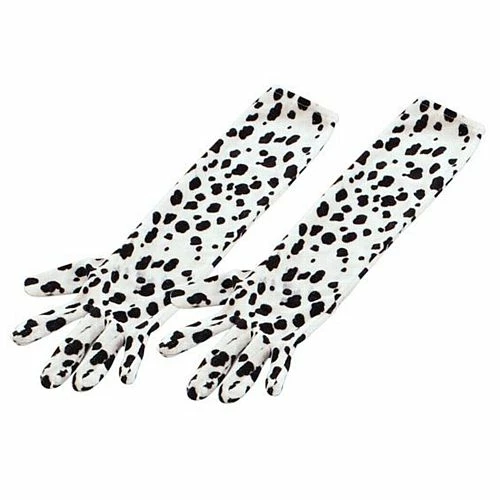 Dalmatian print elbow length gloves. Ideal for a cruella De Vil costume for a film or movie themed fancy dress party or for a dalmatian costume