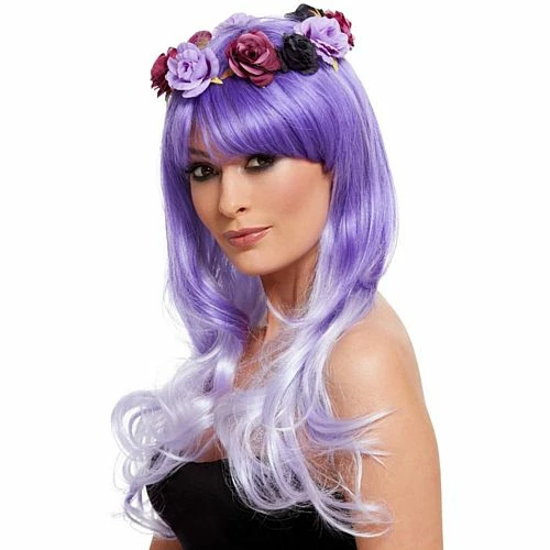 Accessorise your fancy dress costume for Dia de los Muertos with this wonderful Day of the Dead Glam Lilac Flower Crown Wig. Featuring a beautiful floral headband of violet, plum pink and black roses this long purple wig is a stunning choice of fake hair fancy dress accessory for fantasy fairytale parties, festivals, Halloween and LGBT events.