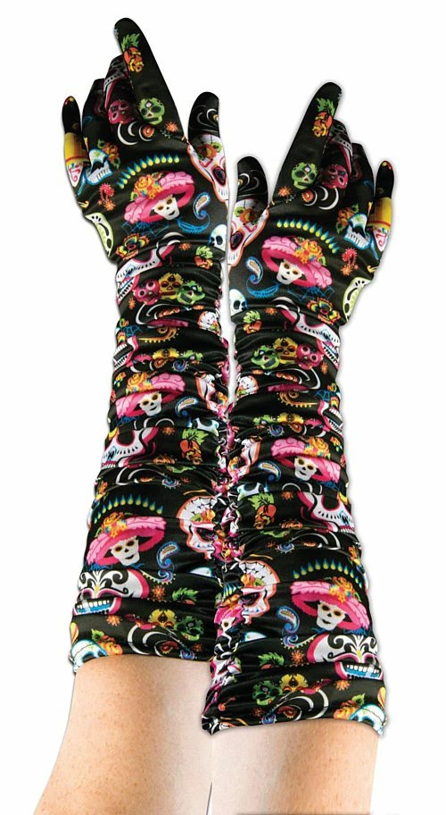 These long black gloves feature a brightly coloured day of the dead design printed all over. Ideal for any day of the dead women’s costume. One size fits most adults