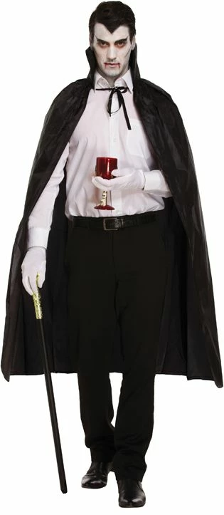 A great value black nylon Dracula vampire cape absolutely perfect for any vampire or gothic count Halloween costume. Accessorise your spooky costume by wrapping this black cloak around your shoulders which ties at the front.