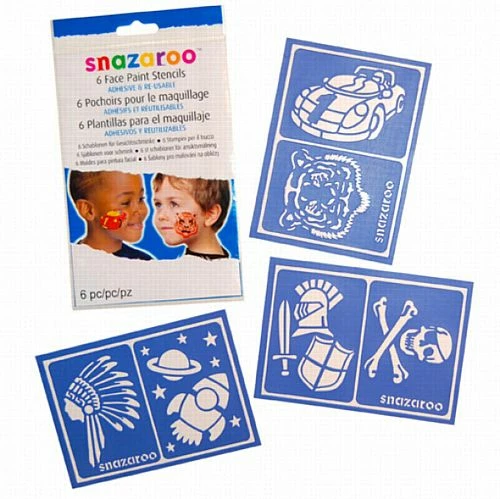 A pack of 6 boys themed face paiting stencil for perfectly neat designs! Simply peel off the backing paper and place the stencil on the face or body and dab some facepaint on with a sponge, using a brush for finer details.