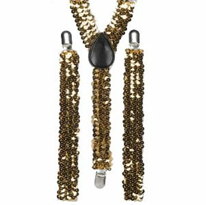 1 pair of Gold Sequinned Braces. An ideal addition to any gangster or ringmaster fancy dress costume. Adjustable to fit most adults.