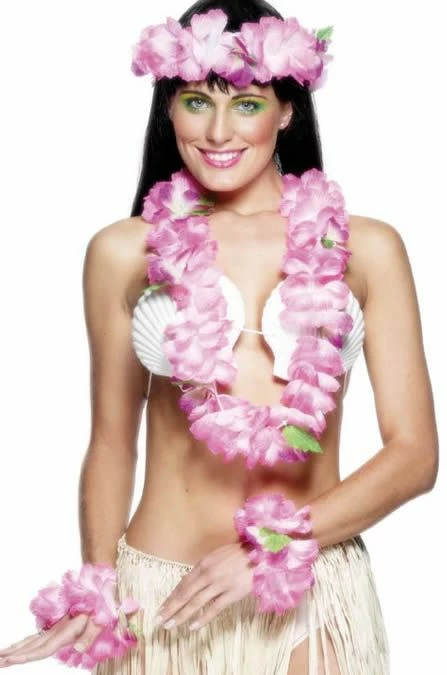 Pink Hawaiian set in two tone, includes head band, wrist bands and leis. Fantastic instant set for any fancy dress party or tropical themed event.