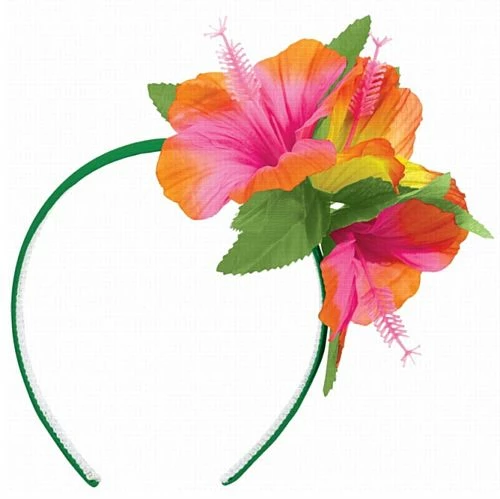 Pretty Hawaiian Hibiscus Headband, great for a tropical outfit or for a Hawaiian luau party. Completey your look with some of our Hawaiian leis and grass skirts