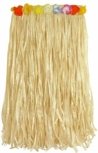 Good Quality Adult Artificial Grass Hula Skirt with Floral Waistband. Natural colour. Ideal for a beach or luau themed fancy dress party! Measures 80cm in width x 80cm in length