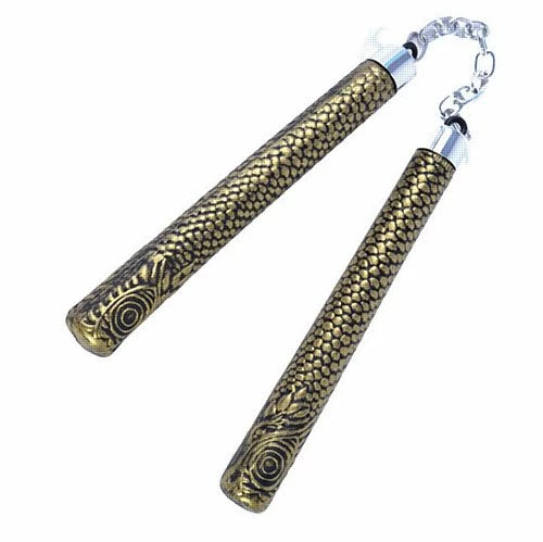 A gold plastic Ninja’s nunchuck. Great for any martial arts themed costume or Oriental fancy dress.