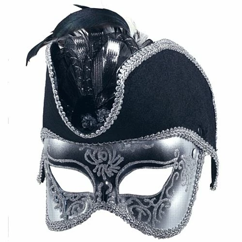 Black and silver pirate design mask with hat and headband. Great for all carnival events, as well as pirate themed parties.