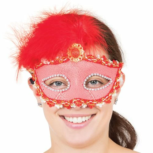 A red eye mask, ideal for a masquerade ball or carnival. The mask features a red and white pattern background, red white and gold braid trim around the edge, diamond trim around the eye holes and a red feather coming from the top with a red jewel in the centre
