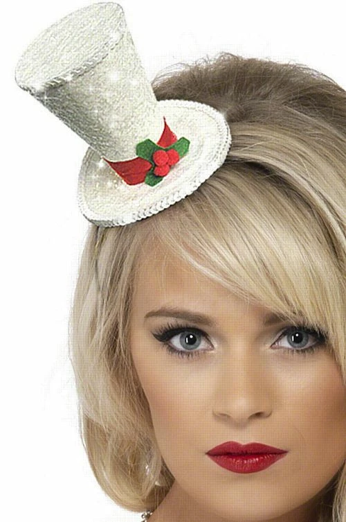 White Christmas Top Hat Headband, Glitter, with Holly on Band. Cute Christmas mini top hat, great to wear with a Christmas costume or on its own as an accessory to add a bit of festive cheers!