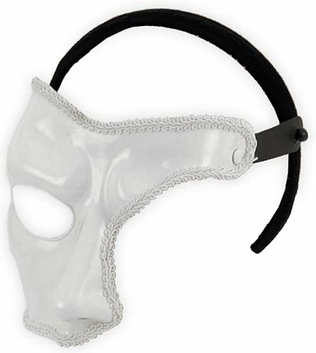 White phantom style mak on a headband. Covers half the face, Intricately moulded to fit the contours of the face. More suited to males, but perfect for masquerades and Theatrical plays.