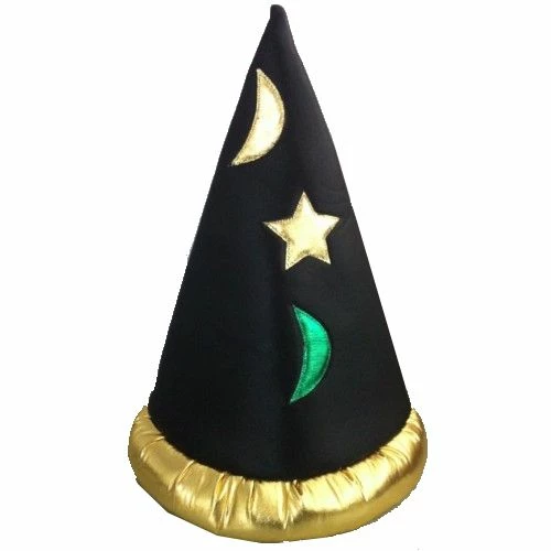 Dress up for Halloween celebrations, Harry Potter themed parties and magical witch and wizard events in this wonderful Wizard Hat Black. This stunning pointed black hat features a gold band and green, blue and gold moon and star motif patches and is a great fancy dress accessory.